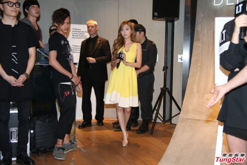 Jessica刚一出场,店外粉丝即在门外叫喊,身穿黄色连身裙的Jessica从楼梯上走下来,工作人员赶紧以黑色外套遮掩其下身,以防她下台阶时走光。虽然这次活动未有安排媒体访问,但Jessica都在台上以流利英语与司仪对话。被司仪问到此次到港的行程和计划,Jessica表示希望可以吃点心和香港美食,也希望在港购物。